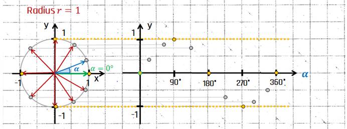 Zeichne danach die Punkte des Einheitskreises auf der Sinusfunktion ein.