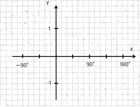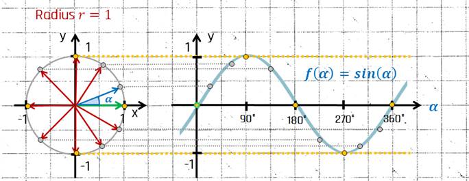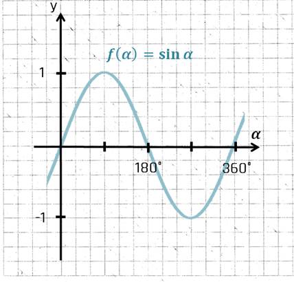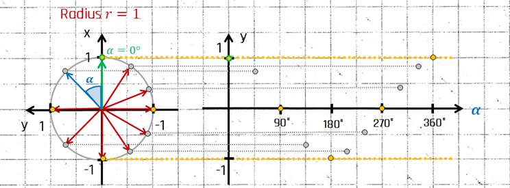Nun dreht sich der Zeiger gegen den Uhrzeigersinn, beginnend auf der x-Achse. Im Bereich von 0° bis 90° wird der Sinus größer. Dann wird er im Bereich 90° bis 270° kleiner, wobei er bei 180° vom positiven in den negativen Bereich sinkt. Von 270° bis 360° steigt er wieder, bis er zu 0 wird. Der Vorgang wird dann wiederholt.