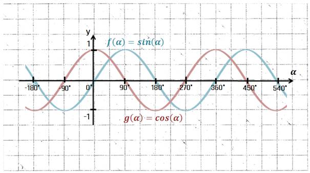 sehen wir dass sich die Werte für Sinus und Kosinus alle 360° bzw alle