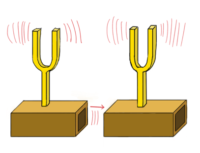 Nun schlagen wir die 1. Stimmgabel an und berühren sie dann sofort wieder, um den Ton zu stoppen. Allerdings schwingt nun die 2. Stimmgabel und erzeugt den Ton, wenn auch etwas leiser.