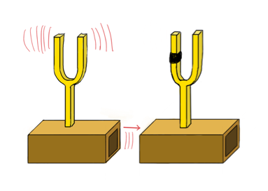 Jetzt setzen wir die Klammer an die 2. Stimmgabel und überprüfen, ob sich die Töne der Stimmgabeln unterscheiden. Dann wiederholen wir den Versuch. Nun schwingt die 2. Stimmgabel nicht mehr mit.
