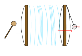 Wenn ein Tamburin angeschlagen wird, dann bewegt sich die Membran nach rechts und verdrängt die Luft. Es bildet sich ein Luftberg (1). Danach schwingt die Membran zurück und es entsteht eine Luftlücke(2). Je nachdem wie das Tamburin schwingt bilden sich also Luftberge und Luftlücken, die dann am anderen Tamburin ankommen und es anstoßen (3).