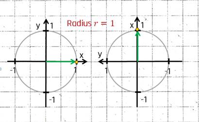 Damit wir dieselbe Vorgehensweise wie beim Sinus verwenden können drehen wir das Koordinatensystem mit Kreis um 90° nach links.