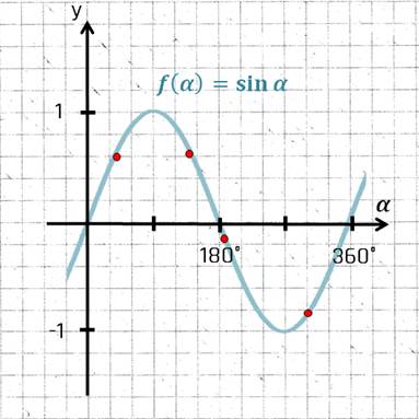Nun dreht sich der Zeiger gegen den Uhrzeigersinn, beginnend auf der x-Achse. Im Bereich von 0° bis 90° wird der Sinus größer. Dann wird er im Bereich 90° bis 270° kleiner, wobei er bei 180° vom positiven in den negativen Bereich sinkt. Von 270° bis 360° steigt er wieder, bis er zu 0 wird. Der Vorgang wird dann wiederholt.